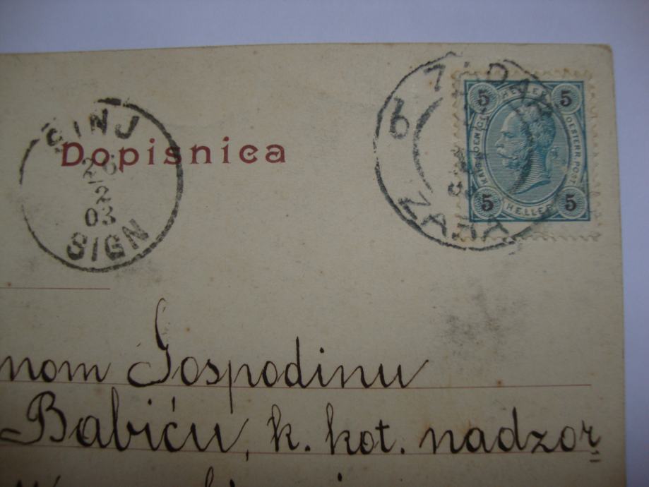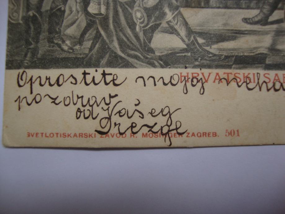 Razglednica sa domoljubnim motivom Hvr. sabora sa velikanima sa kraja 19. stoljeća putovala 1903. godine za Sinj ugledniku