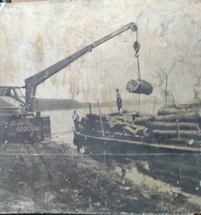 Velika fotografija: Istovar trupaca sa broda na Dravi, za tvornicu žigica Drava Osijek. Vrijeme: između 2 rata.