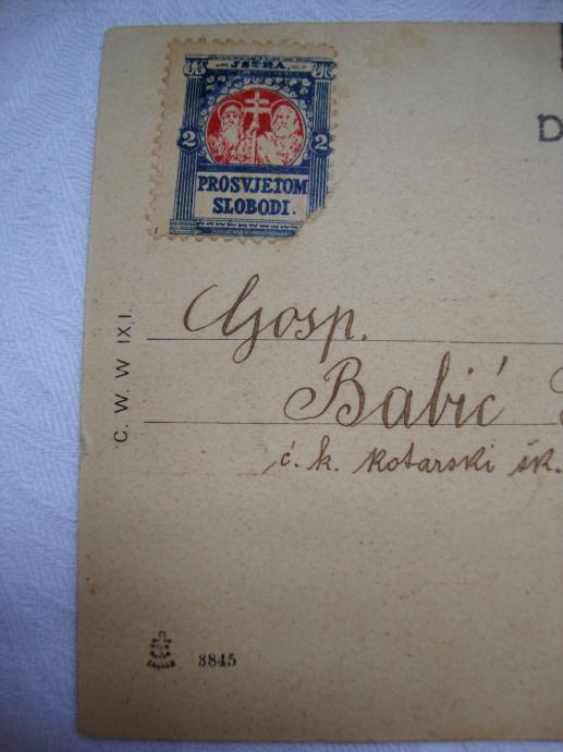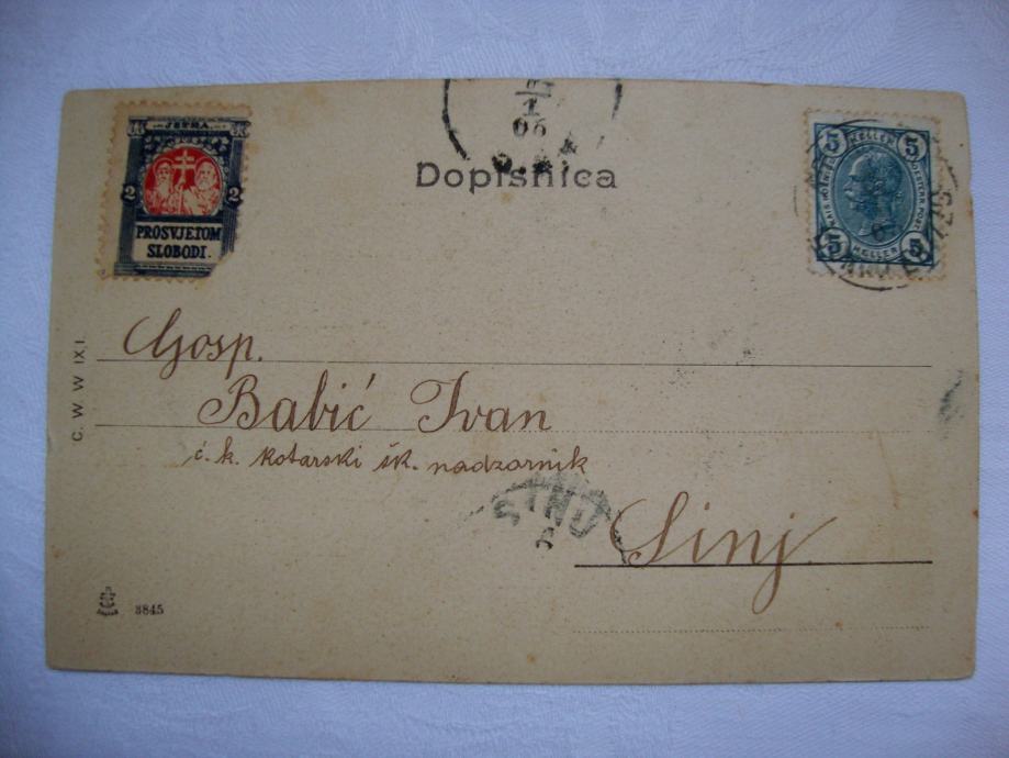 Dopisnica je kolorirana te je putovala prije 115 godina za Sinj - markice dvije i dva štamilja poštanski - očuvano i čitko