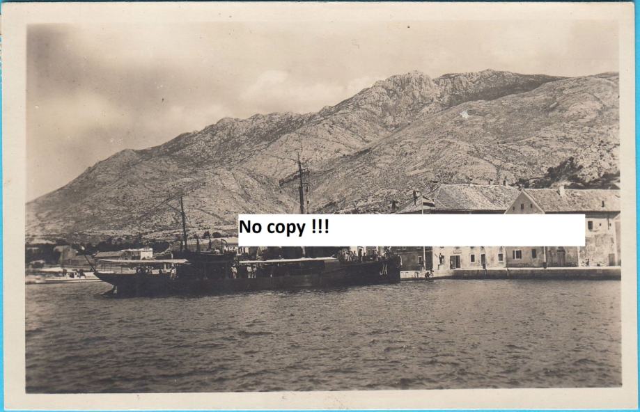 Stara predratna razglednica Karlobaga sa ratnim brodom u luci.