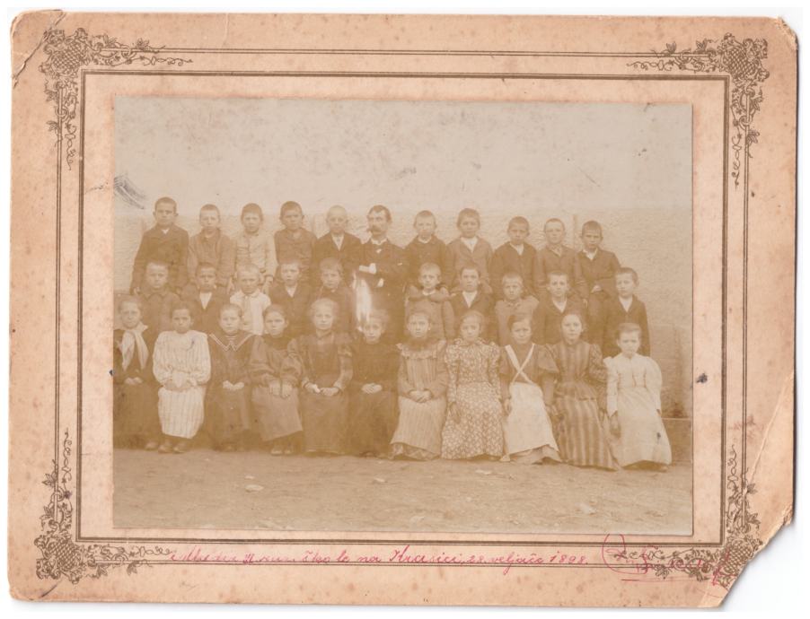 Stara fotografija učenika i jednog učitelja osnovne škole u Krasici datirana 28. veljače 1898.