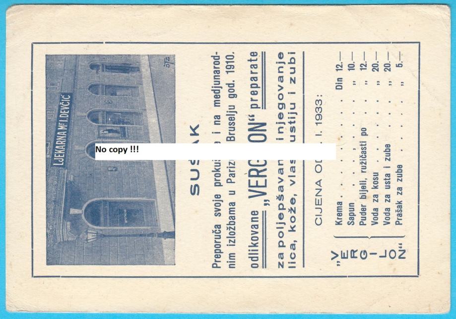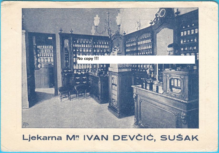 Prekrasna stara reklamna kartica (kao razglednica) Ljekarne Mr. Ivan Devčić sa interijerom ljekarne i ljekarnicima.