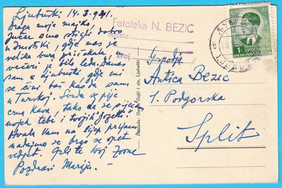 Stara razglednica Ljubuškog, putovala 1941. godine iz Ljubuškog u Split.
