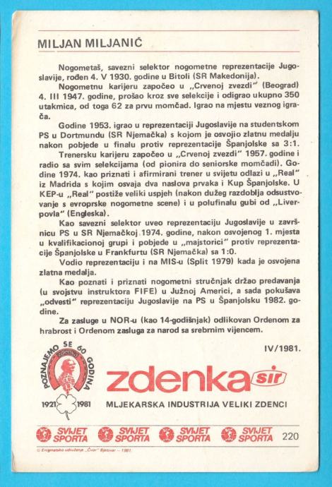 MILJAN MILJANIĆ Fk Crvena Zvezda nogometna kartica svijet sporta