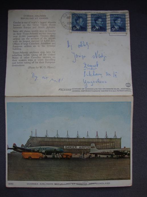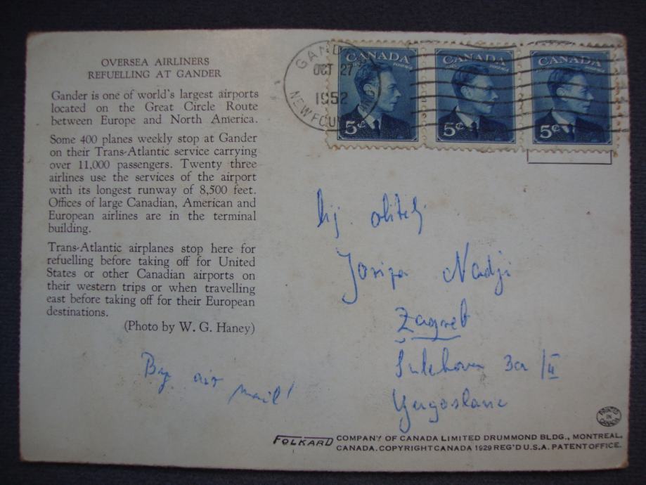Vintage dopisnica Newfoundland putovala 1952.godine avionom za Zagreb