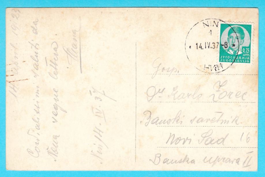 Vrlo zanimljiva stara razglednica Nina iz Kraljevine Jugoslavije, putovala 1937. godine.