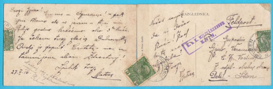 Prekrasna stara dvostruka (dupla) austro-ugarska razglednica Opuzena, putovala 1916. godine tijekom 1. svj. rata sa žigom austro-ugarske vojne cenzure.