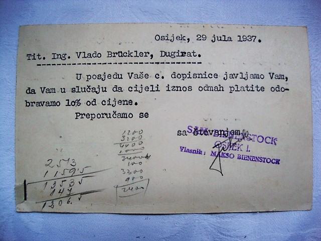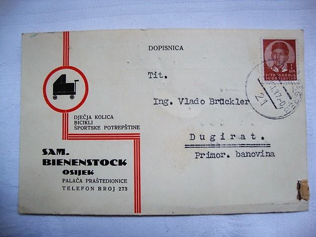 Iznimno rijetko sa pečatom vlasnika Makso Bienenstock trgovac koji je pogubljen u Jasenovcu dopisnica je upućena kupcu iz Dugog rata