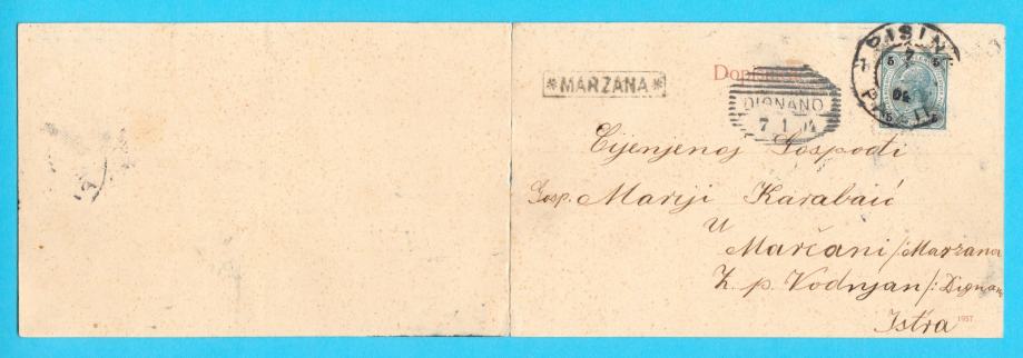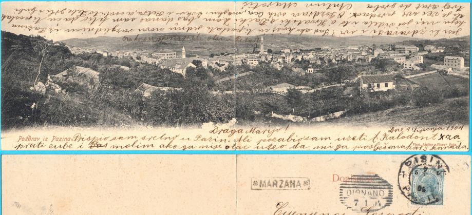Prekrasna stara dvostruka ( dupla ) austro-ugarska razglednica Pazina - putovala 1904. godine iz Pazina u Marčanu z.p. Vodnjan ( Dignano ) sa rijetkim žigom pomoćne pošte Marzana.