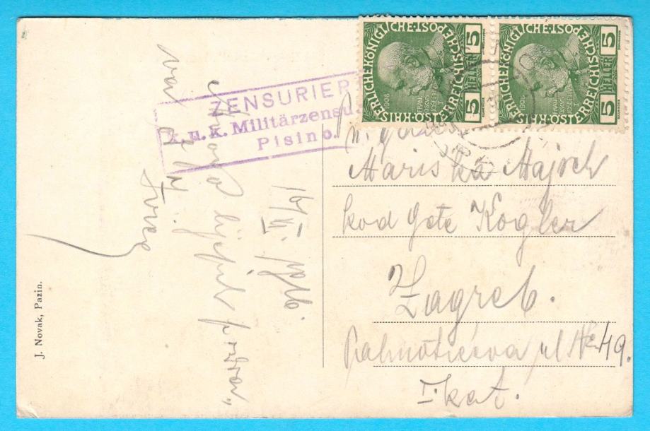 Prekrasna stara razglednica Pazina, putovala 1916. godine, tijekom 1. svjet. rata sa žigom Austro-ugarske vojne cenzure (Pisino - Pazin).