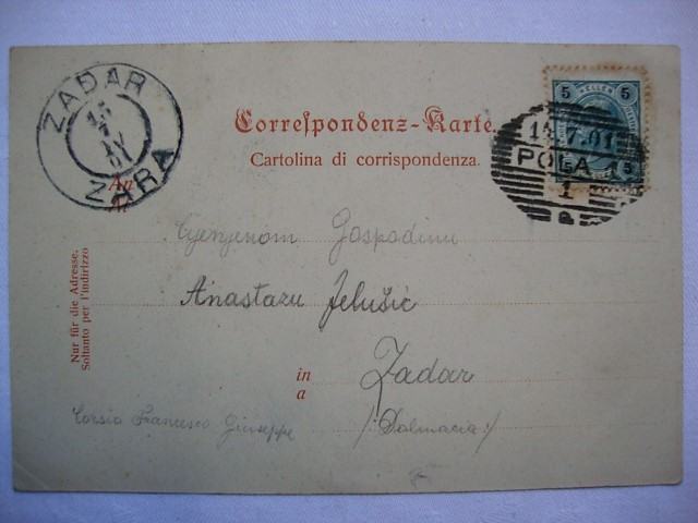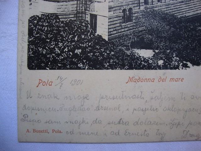 A.Bonetti,Pola ,Dopisnica Pule oko 1899./1900. putovala u Zadar uglednom ljekarniku 1901.