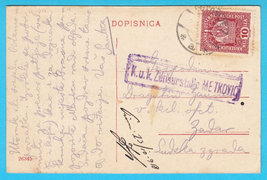 Stara originalna razglednica, putovala ratne 1918. godine sa žigom austro-ugarske vojne cenzure Metković.