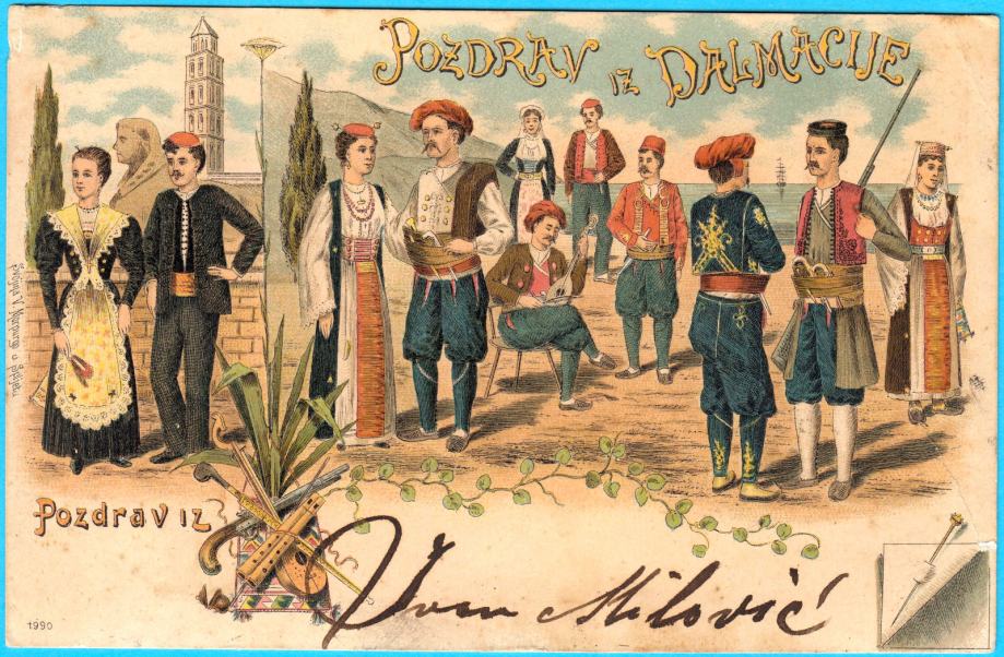 Prekrasna stara austro-ugarskja razglednica sa dalmatinskim nošnjama, te zvonik Sv. Duje i sfinga na Peristilu u Splitu.