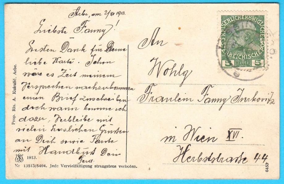 RAB ( Arbe ) ... stara austro-ugarska razglednica, putovala 1913. god.