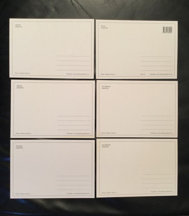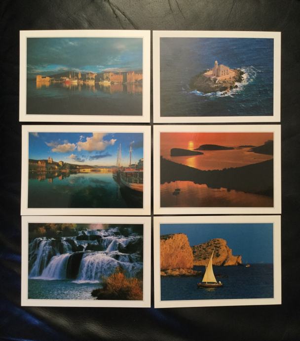 Lot od 6 prekrasnih, nerabljenih razglednica sa motivima iz Hrvatske (Trogir, Mulo, NP Kornati, NP Krka) fotografa Tješimira Marića, dimenzije 16,5 x 11,5 cm. Cijena je za cijeli lot.