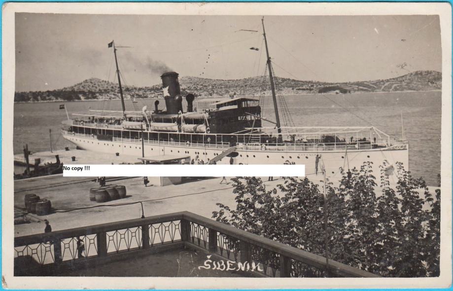 Stara predratna razglednica Šibenika iz 1920-tih godina, čuveni parobrod Karađorđe u Šibenskoj luci (poslije rata preimenovan u "Proleterka").