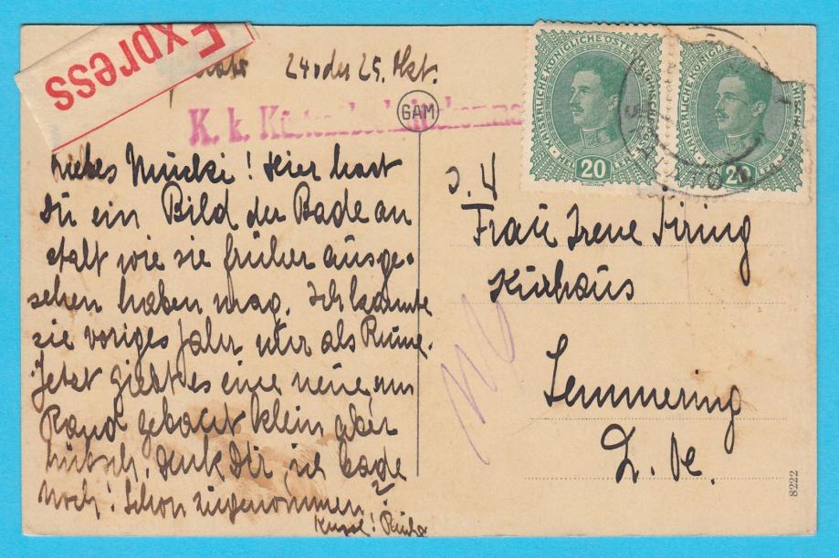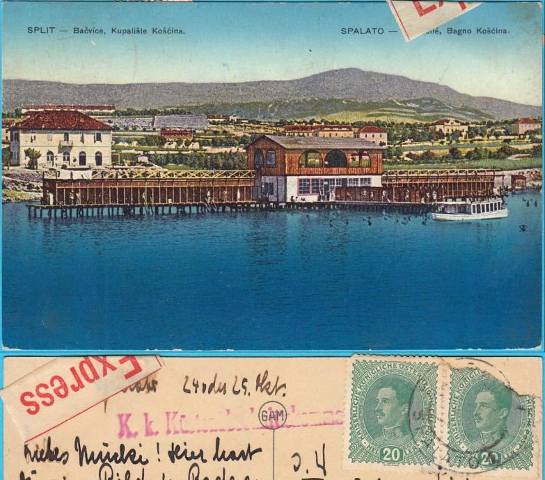 Stara austro-ugarska razglednica Splita, putovala kao brza pošta (Express letter) sa dvije marke od 20. hellera.