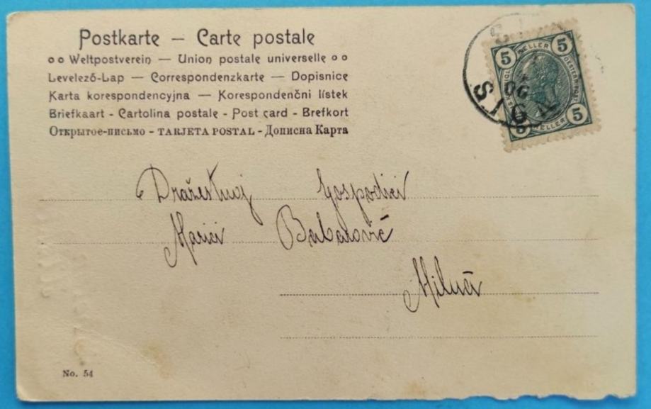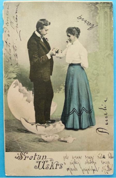 Prekrasna stara Uskršnja čestitka putovala davne 1900-te godine iz Sinja (Sign) u Milnu na otoku Braču, adresirana na dražestnu gospođicu Maricu Babarović.