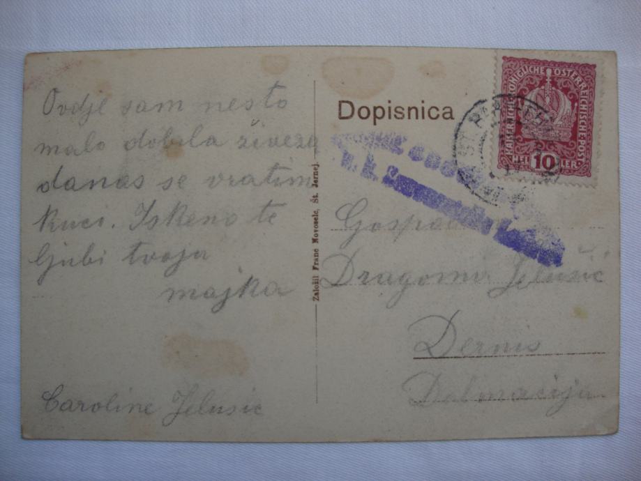 Dopisnica Št.Jernej Dolenjsko stara preko 100 godina putovala 1913. godine za Drniš (Hrvatska )
