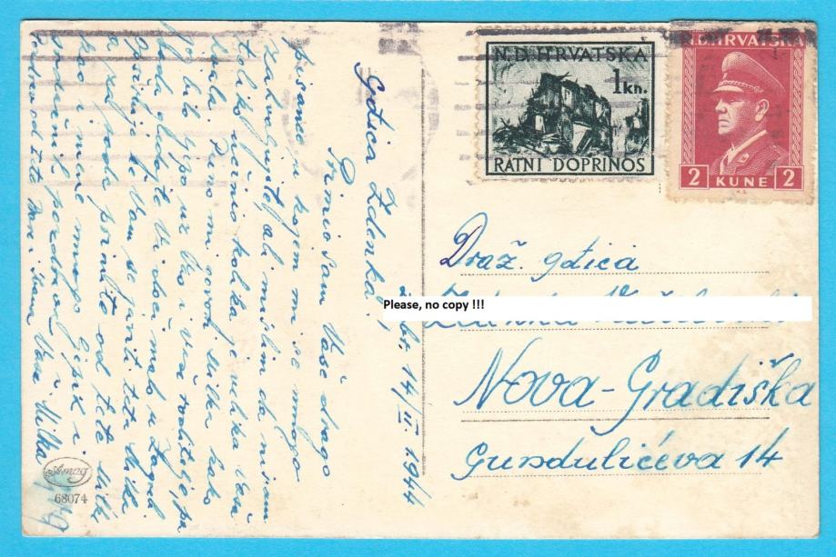 Razglednica je putovala 1944. godine iz Zagreba u Nova Gradiška.