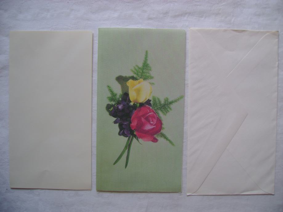 Stara čestitka - Ruže - otisak na svili, Made in West Germany, 9 x 17 cm, na preklop, sa papirom i kuvertom, nekorištena, stanje je vidljivo na slici.