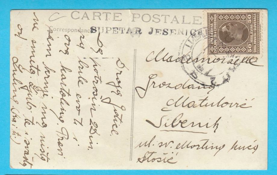 Stara vrlo zanimljiva predratna razglednica Dugog Rata iz Kraljevine Jugoslavije, putovala 1930-tih godina u Šibenik.