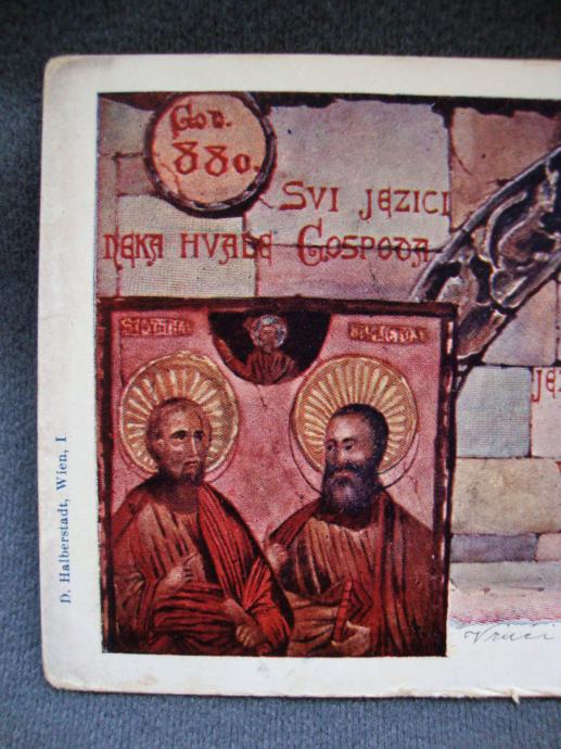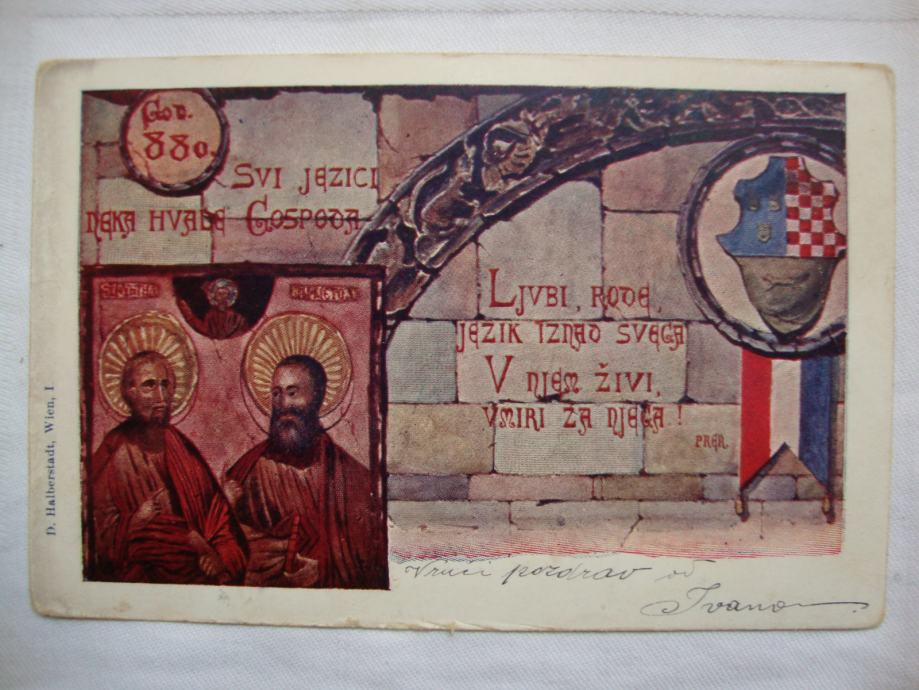 Domoljubna dopisnica sa kraja 19. stoljeća sa motivom Ćirola i Metoda lijevo, te hrvatskim grbom i zastavom desno