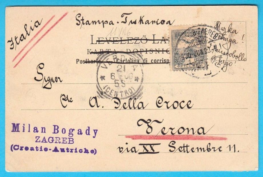 Jako lijepa stara domoljubna razglednica , putovala 1900. iz Zagreba u Veronu (Italija).
