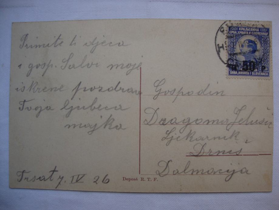Rijetka dopisnica Trsata putovala 1926. godine za Drniš izvrsno očuvana i zaštićena u foliji
