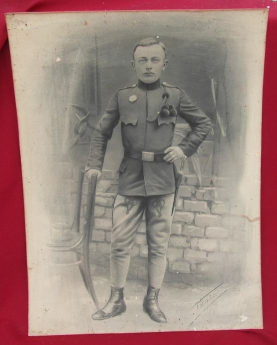 Velika kartonska fotografija husara iz doba Austrougarske rad oznatog koprivničkog fotografa Franje Tkalčeca.Fotografija je snimljena starim drvenim fotoaparatom i mislim da se radi o dagerotipiji.Dimenzije fotografije su 40 x 30 cm.