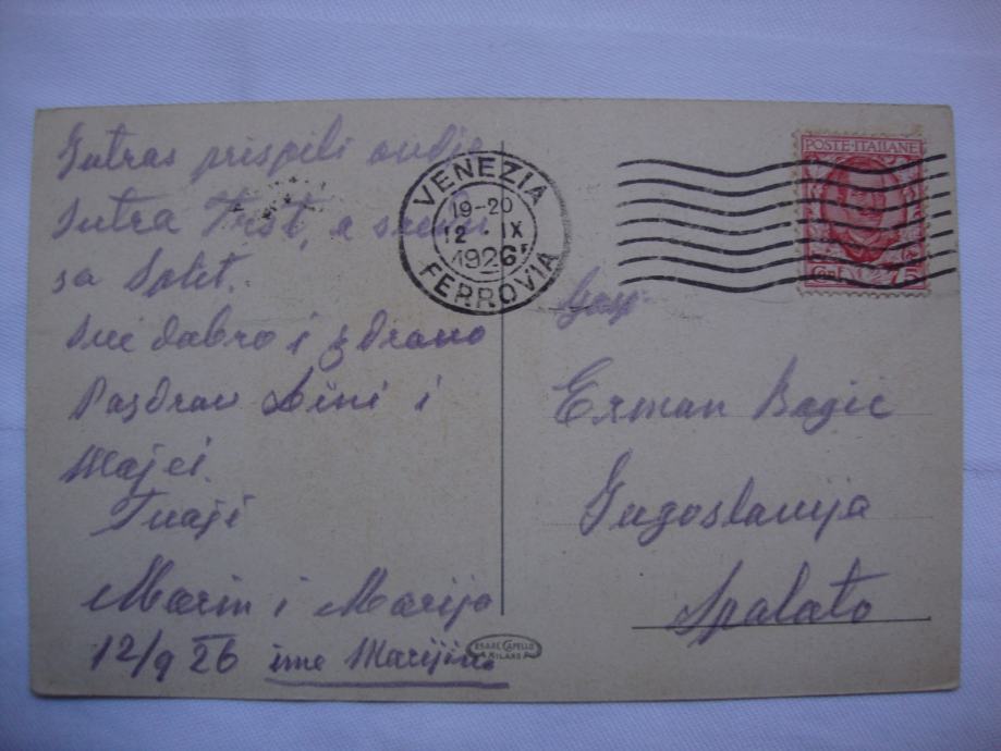 Stara razglednica putovala vlakom Venezija -Spalato 1926.godine