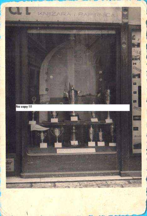 Prekrasna stara foto razglednica sa peharima (nagradama) VK Krka Šibenik osvojenima na najvećim veslačkim takmičenjima u 1939. godini.