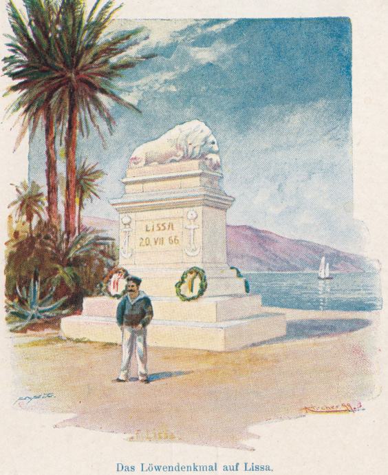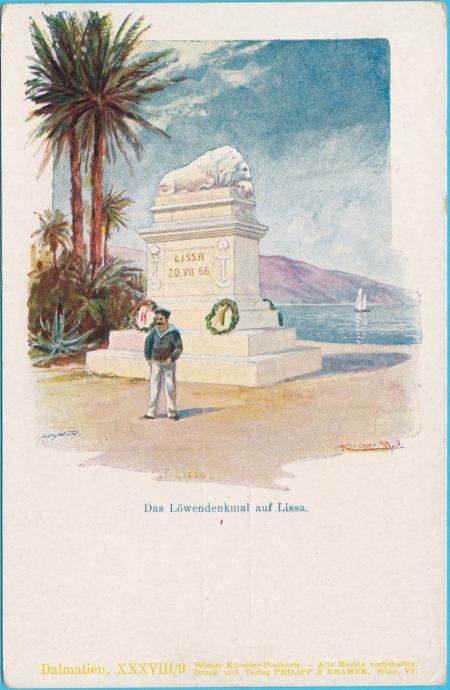 Prekrasna stara austro-ugarska razglednica sa spomenikom na austrijske mornare poginule u Bici kod Visa 1866. godine. Ovaj su spomenik kasnije Talijani razmontrirali i odnijeli u Italiju (Livorno).