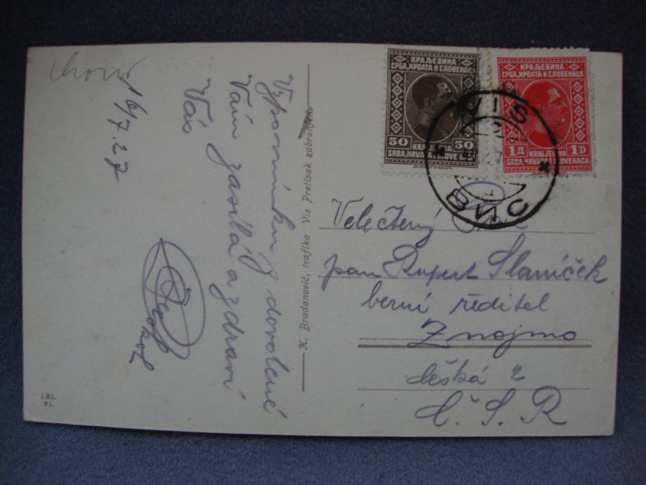 Dopisnica Visa putovala 1927. godine za Češku nakalda K.Bradanović - Muzekjski i kolecionarski primjerci iz zbirke otok Vis