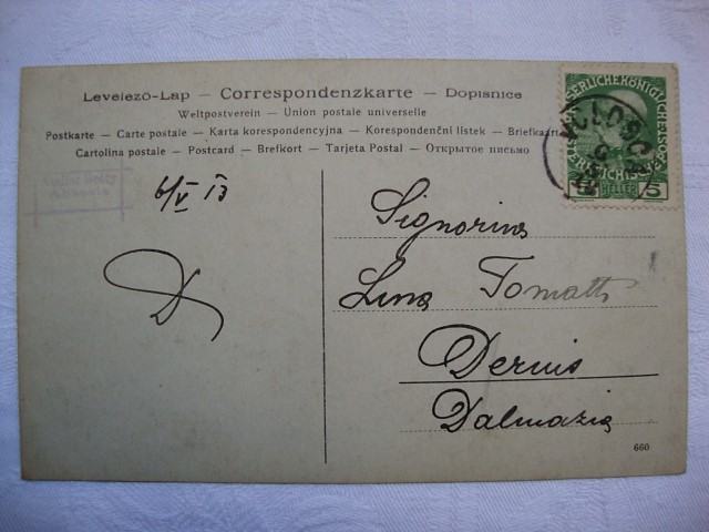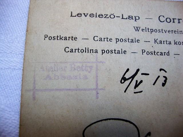 Motiv sa palmama rijetko izrađena ranije a putovala 1913. godine za Drniš ima ljubičasti pečar Atelier Betty Abbazia