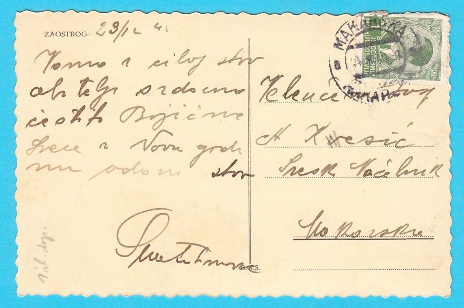 Stara predratna razglednica Zaostroga, putovala 1940-te godine Sreskom načelniku u Makarsku.