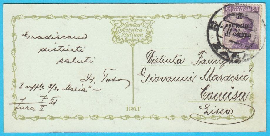 Vrlo zanimljiva razglednica malog formata, putovala 1921. godine u Komižu - Otok Vis (Comisa - Lissa), adresirana na gosp. Giovanni Mardešić.
