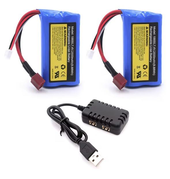 Prodajem dvije nove baterije u kompletu i punjac za RC modele s T konektorom, 2500mAh 7.4V Li-ion.