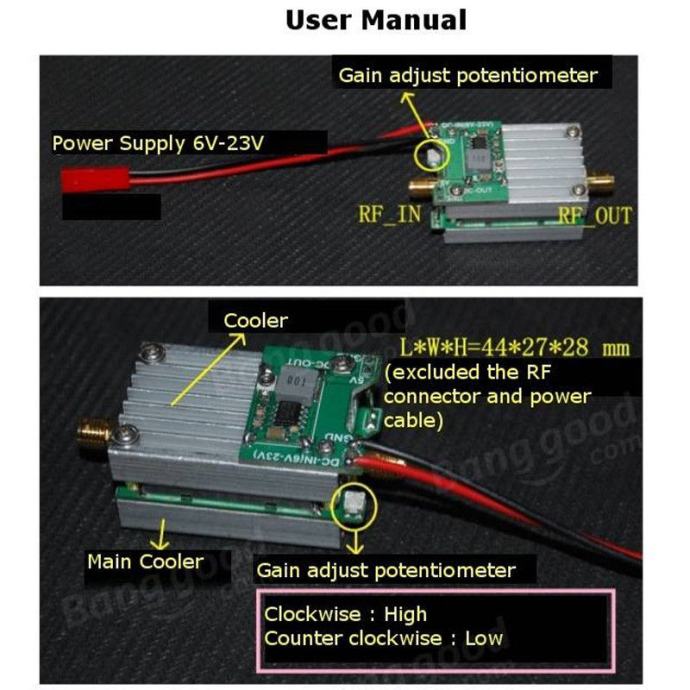 Gain Adjustmeng Range : 3dB-6dB @ 5.60GHZ-5.75GHZ/5dB-8dB @ 5.75GHZ-5.85GHZ/3dB-7dB @ 5.85GHZ-6.00GHZ(if there is cooling fan, the gain will be 2dB higher,eg 5dB-8dB will be 7dB-10dB )
