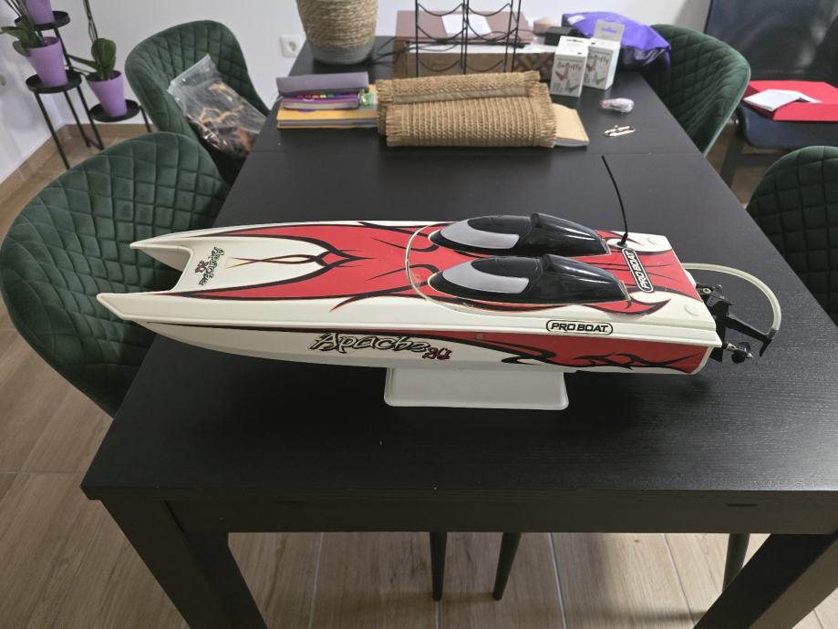 Prodajem RC gliser Proboat Apache 24, brzi katamaranski brod na daljinsko upravljanje. Model je u crveno-bijeloj boji s atraktivnim grafičkim detaljima. Gliser nudi odlične performanse. Dolazi sa motorom i ESC-om, treba vam još baterija, stanica i prijemnik