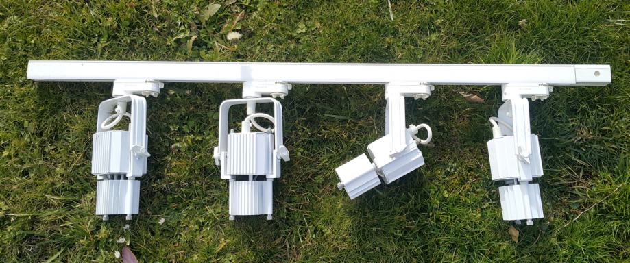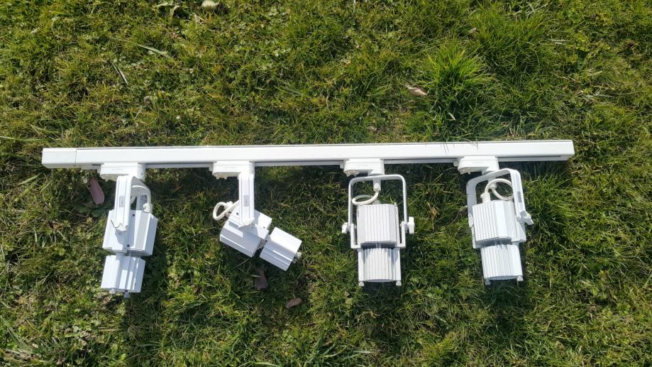 ISPRAVNO,NIKADA KORIŠTENO,SAMO ISPROBANO.(PROBUŠENA JEDNA DODATNA RUPA NA VODILICI,MISLIO STAVITI U SVOJU RADIONU ALI POŠTO MI JE NIZAK STROP NIJE MI BILO NAJSRETNIJE RJEŠENJE)) 4 KOMADA REFLEKTORA + VODILICA (ŠINA) DUŽINE 106cm.MADE IN FINLAND (JEDAN PLAČEN 1100,00kn,ŠINE NEMA ISPOD 300,400kn).12V ADAPTER U SVAKOM REFLEKTORU.TEŠKO,MASIVNO,KVALITETNO.