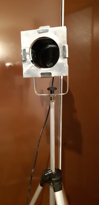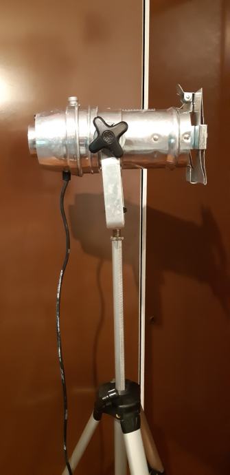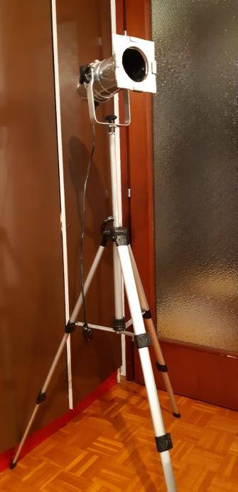 Stalak je stari foto tripod s mogućnošću regulacije visine i smjera.