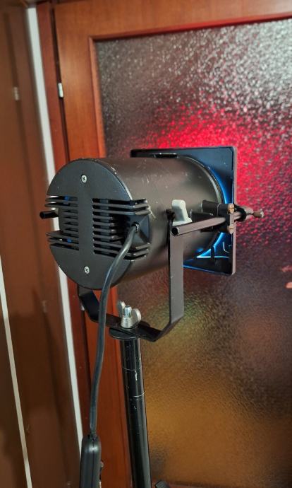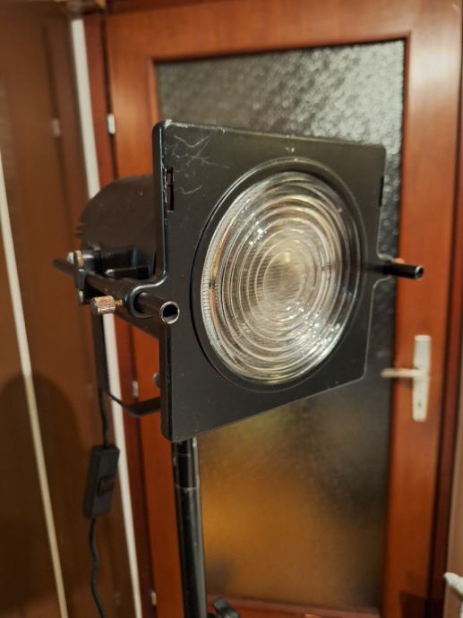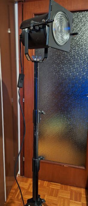 Tripod je rasvjetni, crni, lagani, sklopivi, podesive visine.
