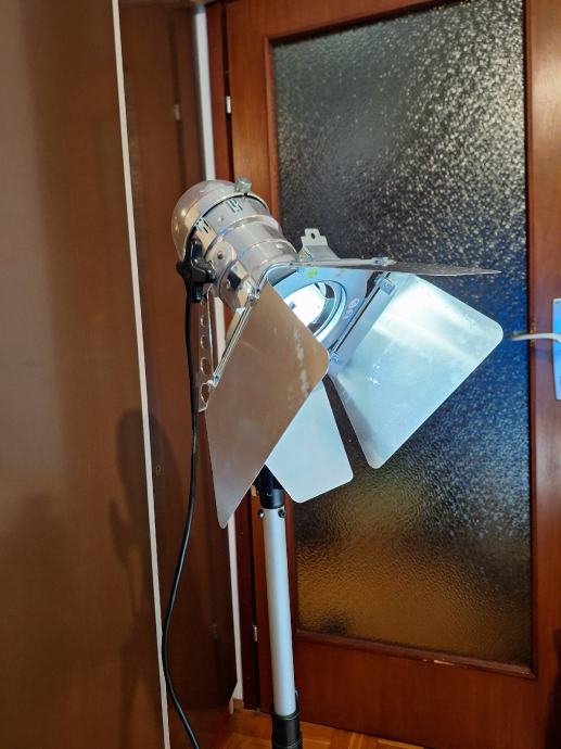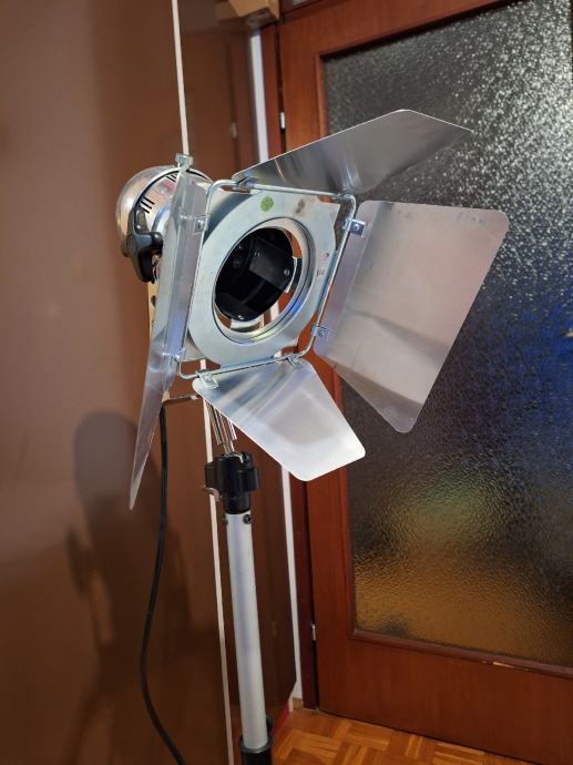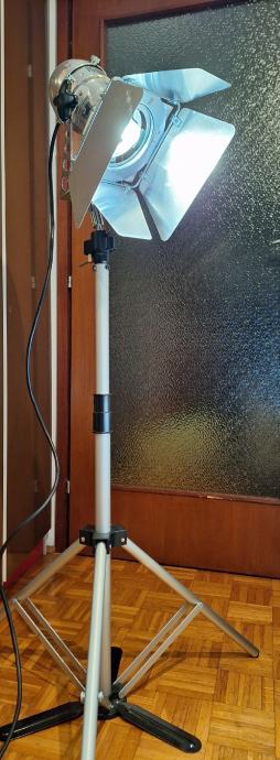 Reflektor je od poliranog aluminija, opremljen klapnama i grlom E27 sa LED reflekta žaruljom. Stalak je fotografsko rasvjetni sklopivi tripod promjenjive visine.