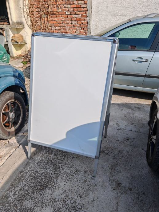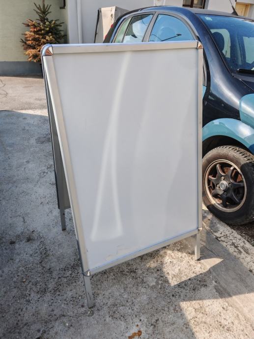 Prodajem rabljeni A-board reklamni pano s aluminijskim okvirom i click sustavom za jednostavnu izmjenu plakata. Pano je dvostran, slobodnostojeći, stabilne konstrukcije koja se drži uspravno bez dodatnog oslonca. Prikladan za izlaganje u ugostiteljskim ili trgovačkim prostorima, ispred lokala ili na sličnim mjestima.