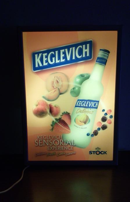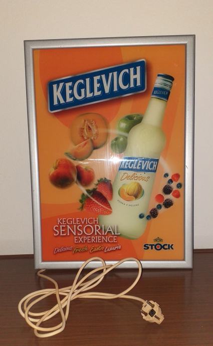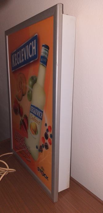 Stara svjetleća reklama KEGLEVICH iz 70ih, zidna, plexiglas, metal, drvena rama, talijanska proizvodnja, dugi kabel za struju, na reklami prekidač za paljenje/gašenje, ispravna, odlično stanje, dim. 53x38x7 cm...