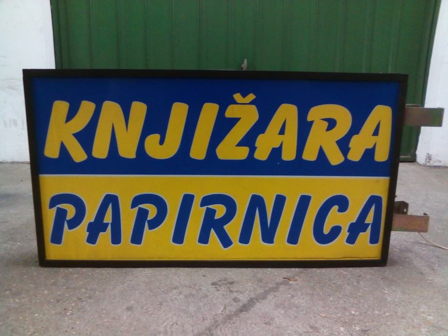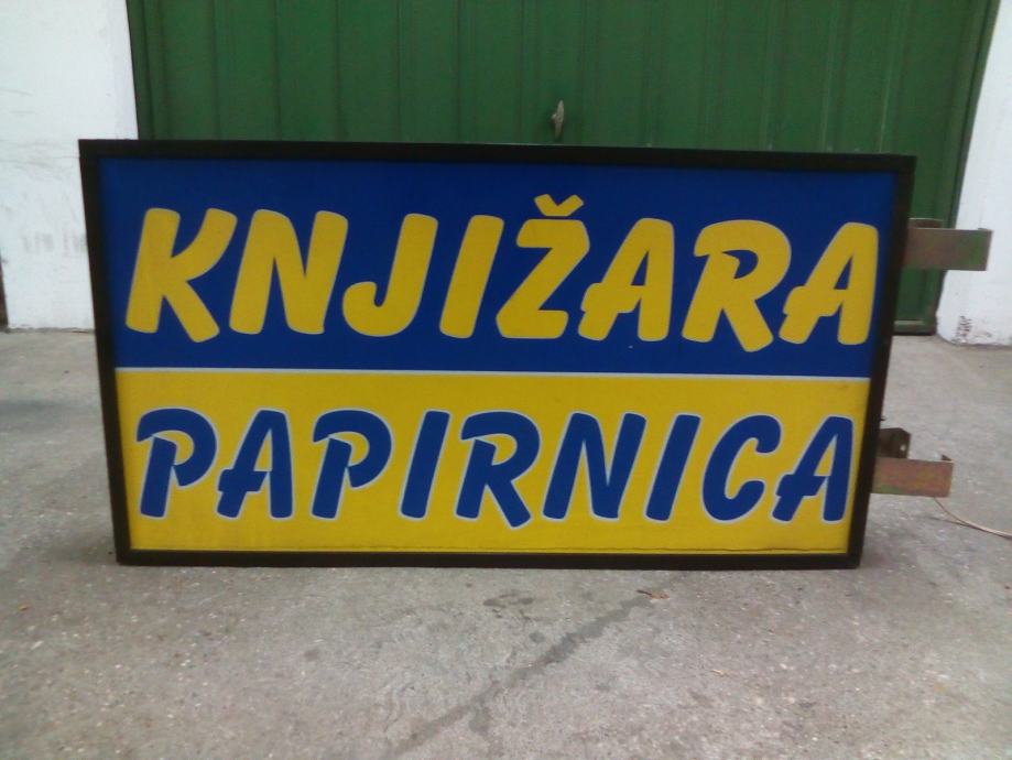Prodajem obostrano svjetleću zidnu reklamu. Trenutno se na njoj nalazi natpis knjižara/papirnica, što se lako može promjeniti u bilo koju drugu reklamu. Unutra su dvije flourescentne cijevi, provedena je žica za spajanje po želji (bila je na prekidač unutar prostora). Reklama svjetli obostrano i to dosta jako. Ima dva nosača za montažu na zid. Dimenzije su 100 cm x 54 cm, dubina je 13 cm, a nosači su 10,5 cm. Stanje vidljivo na slikama.