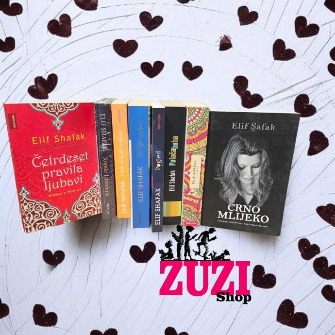 Četrdeset pravila ljubavi„Četrdeset pravila ljubavi“ je roman o četrdeset pravila lutajućeg derviša Šamsa, mistika i filozofa, koje on tumači kao osnovne principe duhovnosti i ljubavi. On kroz svoju filozofiju razdvaja religioznost od duhovnosti. Šams godinama luta Istokom, tragajući za srodnom dušom, koja bi razumjela njegovo fiozofsko shvatanje duhovnosti.Voleti u tišini u romanu „Četrdeset pravila ljubavi“Ovaj predivni roman „Četrdeset pravila ljubavi“ prati dvije radnje, dvije grupe likova, dvije epohe – sadašnje vrijeme, čiji su predstavnici Ela sa svojom porodicom i Aziz Z Zahar sa svojim romanom ,,Slatko bogohuljenje” i 13. vijek, čiji su predstavnici sufijski pjesnik Rumi i lutajući derviš Šams iz Tabrizija, koji su likovi Azizovog romana.„Četrdeset pravila ljubavi“ je roman o četrdeset pravila lutajućeg derviša Šamsa, mistika i filozofa, koje on tumači kao osnovne principe duhovnosti i ljubavi. On kroz svoju filozofiju razdvaja religioznost od duhovnosti. Šams godinama luta Istokom, tragajući za srodnom dušom, koja bi razumjela njegovo fiozofsko shvatanje duhovnosti.OTOK NESTALIH STABALADefne i Kostas na suprotnim su stranama podijeljene zemlje; ona je Turkinja, on Grk, oboje Cipar nazivaju domom, a njihova je ljubav zabranjena. Jedino mjesto na kojem se mogu sastajati jest konoba Sretna smokva, nazvana tako zbog čudesnog stabla Ficus carica koje raste usred prostorije. Ta će smokva svjedočiti njihovim sretnim susretima te tihim rastancima, ali bit će ondje i kada izbije rat, pretvori grad u ruševinu i razdvoji ljubavnike. Desetljećima kasnije, šesnaestogodišnja Ada, rođena u Londonu, počinje se interesirati o zemlji svojih predaka. Nikada nije posjetila Cipar, a jedina veza s tim otokom stablo je smokve koje joj raste u dvorištu. Kakva će se priča rasplesti pred Adom jednom kad uroni dublje u obiteljske tajne?U romanu Otok nestalih stabala nagrađivana autorica Elif Shafak donosi nam raskošnu priču o pripadanju i identitetu, ljubavi i boli, sjećanju i zaboravu, ljudskom uništavanju prirode te napokon – obnovi, u svakom smislu te riječi.„Briljantan roman – u skladu s Shafakičinim karakterističnim suosjećanjem prema nevidljivima i nevoljenima, prema onima koje je povijest izgnala, isključila i razdvojila. Znam da će ganuti mnoge čitatelje diljem svijeta jednako onako kako je ganuo mene.“Robert Macfarlane„Čaroban roman koji nas odvodi na putovanje i koji istodobno otkriva recentnu povijest i svijet prirode te je tako nenametljivo dubok.“William Boyd„Shafak je tako strastveno zainteresirana za rušenje granica, bile one rasne, nacionalne, kulturne, rodne, zemljopisne ili mistične.“Sunday Times„Izvanredno djelo zadivljujuće ljepote.“Lemn Sissay Obe„Pjeva svim osjetilima.“Polly Samson„Briljantan roman.“Robert MacFarlane„Čaroban roman koji nas odvodi na putovanje.“William Boyd„Melem za naše ranjeno vrijeme.“David Mitchell„Ljupki roman-srcolomac koji se bavi pitanjima mračnih tajni građanskih ratova & zlom ekstremizma: #Cipar, ljubavnici koje je spojila sudbina, ubijeni bližnji, traumatizirana djeca. Iskorijenjivanja.“Margaret Atwood na Twitteru„Prekrasna i čarobna priča ispunjena ljubavlju. Zapanjujuće djelo.“Ruth Jones„Knjiga koju treba čuvati i uživati u njoj.“Naomi KleinKopile IstanbulaU Istanbulu, u obitelji Kazanci u kojoj, zbog čudnih usuda sudbine spram muškaraca, caruju žene odrasta Asya, mlada djevojka deklarirana nihilistkinja, opijena Johnny Cashom i francuskim egzistencijalistima. Na drugom kraju svijeta, u San Franciscu, živi Armanoush, devetnaestogodišnja Amerikanka armenskog podrijetla koja se bori s osjećajem nepotpunosti u svom identitetu. Da bi pronašla kariku koja nedostaje odlučuje tajno otputovati u Istanbul... "Kopile Istanbula" roman je o dva naroda, turskom i armenskom, i dvije obitelji koje su povezane mračnom tajnom iz prošlosti više nego što i jedna od njih može naslutiti. To je roman o sjećanju i zaboravu, o prošlosti i sadašnjosti u kojem se isprepliće tradicija i suvremenost. Elif Shafak istkala je nezaboravnu priču o gradu Istanbulu i njegovim stanovnicima, o njegovim bojama, mirisima i okusima ali i o tajni koju krije.Po objavljivanju ove knjige Elif Shafak je optužena, od strane ultranacionalista, za pomanjkanje turskosti i vrijeđanje turske nacije jer je roman, prije svega, napisala na engleskome jeziku a u njemu je progovorila o stradavanju Armenaca i krahu Otomanske imperije s početka 20. stoljeća. Roman je izazvao pravu buru reakcija, u obranu Elif Shafak stala je cijela svjetska literarna javnost te je ona nakon svih pritisaka oslobođena optužbi po zloglasnom članku 301. Turskog kaznenog zakona. Prema odredbama iz ovog članka „za klevetu protiv turskog nacionalnog identiteta“ može biti izrečena kazna i do tri godine zatvora. Pred početak suđenja Elif Shafak je za BBC izjavila: „Ako se članak 301. bude i nadalje ovako interpretirao nitko više u Turskoj neće pisati romane ni snimati filmove.“ „Riječi koje izgovaraju likovi mogu se upotrijebiti kao dokaz protiv pisca ili redatelja filma. Mislim da je izuzetno važno braniti autonomiju umjetnosti i knjizevnosti“, dodala je Elif Shafak.Tri Evine kćeriFascinantno istraživanje vjere i prijateljstva, bogatstva i siromaštva i razarajućeg sukoba tradicije i modernosti - Independent.Nazperi (Peri) Nalbantoglu pripadnica je istanbulskog visokog društva. Na putu do luksuzne vile uz more, gdje je čekaju muž i prijatelji, skitnica joj otme torbicu. Iz nje ispadne stara polaroid-fotografija triju žena i jednog muškarca, snimljena nekad davno pred Oksfordskim sveučilištem i potakne neželjenu lavinu sjećanja na događaje iz dugo potiskivane prošlosti. Kad napokon stigne na večeru, dok ostali gosti uživaju u sljedovima hrane i raspravljaju o Turskoj na razmeđu Istoka i Zapada, Peri priziva u sjećanje Shirin, Monu i Azura, 