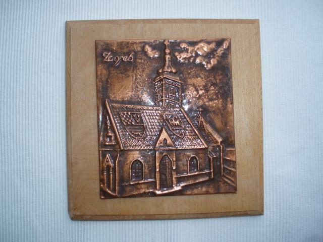 prikaz crkve Svetog Marka na Gornjem gradu, Zagreb, materijal bakar na drvenoj ploči dimenzija 20x20 cm