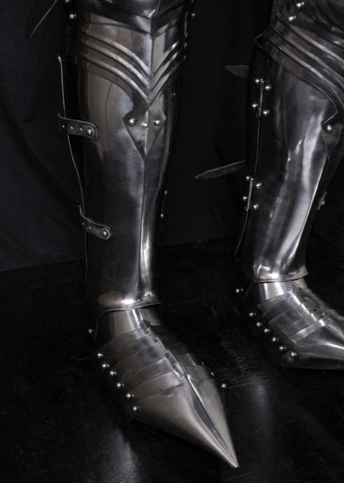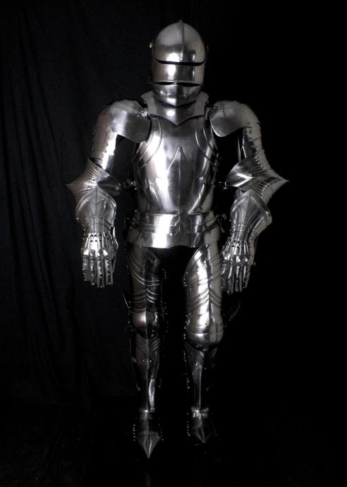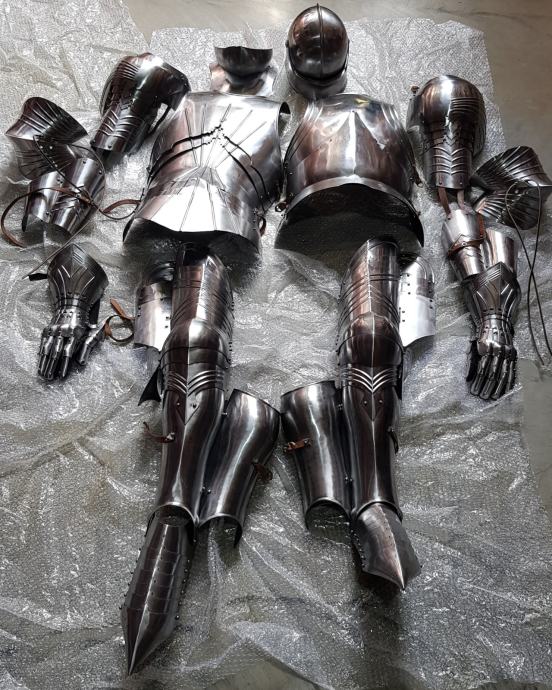 Ovo je vrlo dekorativna rekonstrukcija njemačkog oklopa s kraja 15. stoljeća. Ručno je izrađen od čeličnog lima. Svi komadi su zglobni, tako da je nosiv. Pločasti oklop obično je bio prilagođen u srednjem vijeku. Ovdje nudimo standardiziranu veličinu za muškarce prosječnog rasta i tjelesne visine od oko 1,75 m do 1,80 m. Ali podesivi remeni i kopče su zakovicama za važne dijelove. Tako da je moguće prilagoditi oklop svojoj veličini. Naravno, ne možete očekivati 100% točnost pri postavljanju.